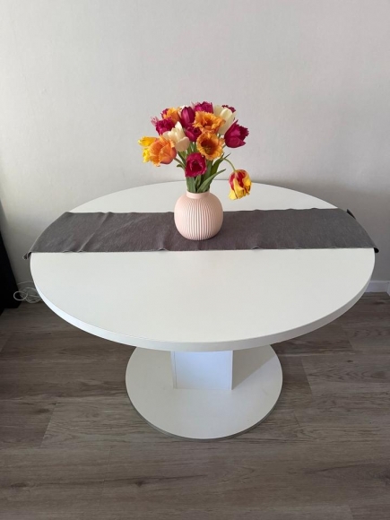 Der Durchmesser ist 120 cm .Ausgezogen kommen noch 40 cm hinzu.
