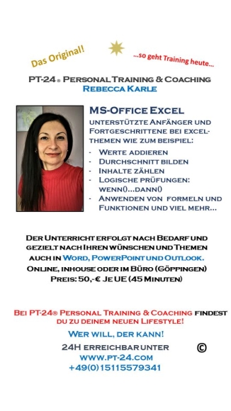 biete Unterstützung und Nachhilfe bei vielen Excel-Themen, aber auch in Word, PowerPoint & Outlook.