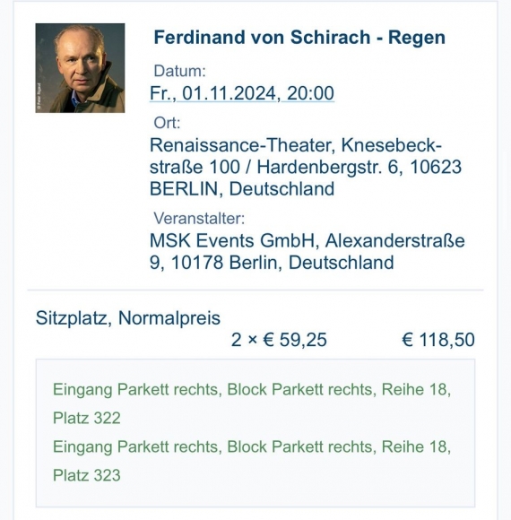 Ferdinand von Schirach „Regen“ am 01.11.2024 (2 Tickets) BERLIN