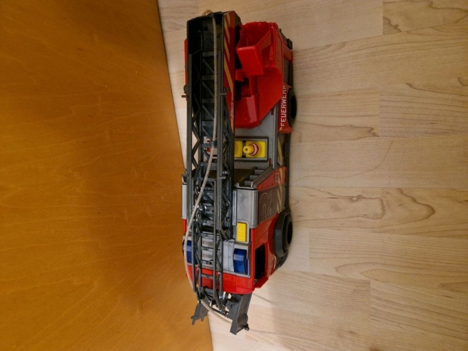 Das Feuerwehrauto hat ein paar Gebrauchsspuren siehe Bilder. Das Körbchen wurde mit 2 Kabelbindern fest gemacht, die Leuchten, Blaulicht und das Geräusch der Sirene funktionieren. Die Drehleiter kann man herausfahren.