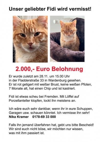 Mein über alles geliebter Fidi ist verschwunden. Er ist ein 7-Monate alter rot-getigerter Kater mit weißer Brust, keine weißen Pfoten. Er ist am Nachmittag des 28.11. in der Fladderstraße in Wardenburg verschwunden. Wenn ihr irgendwas hört, bitte melden. Er ist kastriert, hat einen Chip und ist bei Tasso gemeldet.