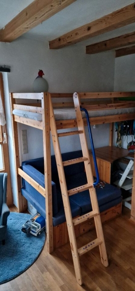 Gebrauchtes Flexa Kiefer Hochbett ohne Matratze. Bezüge waschbar. Wurde angepasst damit es in unsere Nische passt( siehe Bild grüne Makierungen). Anordnung von Coutch/Schreibtisch kann variiert werden.
