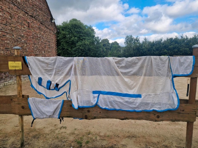 Verkaufe hier eine Fliegendecke mit Hals und Bauchlatz. Habe die decke gewaschen aber alle Flecken gingen nicht raus. Hinten am Schleifsatz würde sie genäht, sehe letztes Bild.
