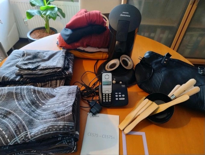 Flohmarkt, Kaffeemaschine, Telefon, Bettzeug