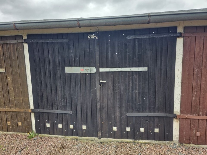 Die Garage verfügt über einen stabilen Metallriegel, ein dichtes Dach und Strom bzw. Licht. Ein mittelklasse-Kombi passt problemlos hinein.