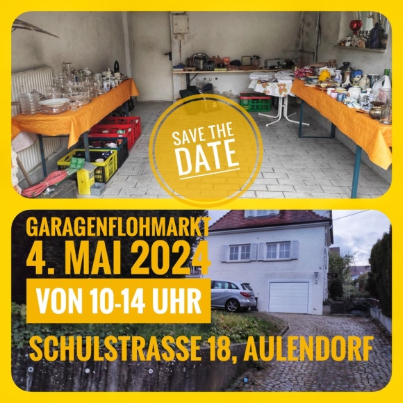 Am kommenden Samstag, den 4. Mai 2024 findet wieder von 10 Uhr - 14 Uhr ein Garagenflohmarkt in der Schulstraße 18 in 88326 Aulendorf statt!