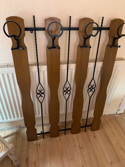 Schöne Garderobe aus Holz und Schmiedeeisen ist übrig und passt nicht mehr in den Eingang.