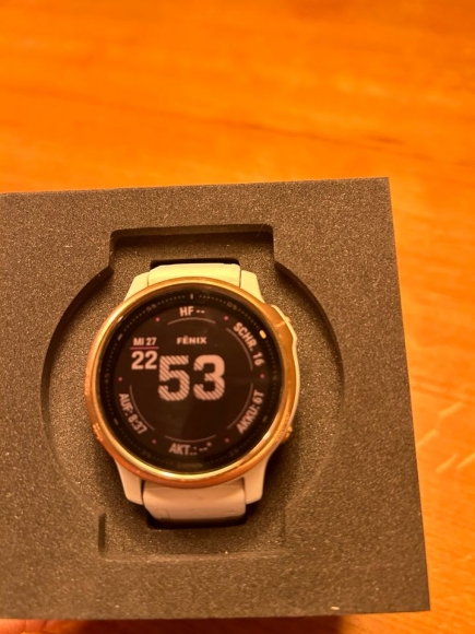 Biete eine Garmin 6S Pro in der Farbe Rose Gold, 10 Monate alt. Die Uhr ist in einem sehr guten Zustand. Ich habe sie im Februar 2023 von Garmin als Ersatzgerät für eine defekte Uhr erhalten. Die Uhr hat wenige Gebrauchsspuren, Glas einwandfrei, an der Lünette wenige unauffällige Kratzer, Armband weist übliche Abnutzung auf.