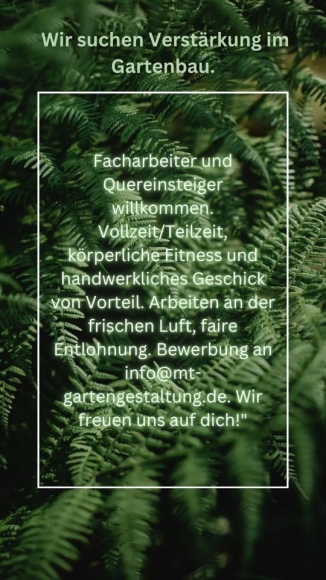 Verstärkung unseres Teams suchen Wir ab sofort Facharbeiter im Garten und Landschaftsbau . So wie Quereinsteiger möglich , für eine Vollzeit / Teilzeit stelle . Körperliche Fitness sowie Handwerkliches Geschick ist von Vorteil . Wir bieten :