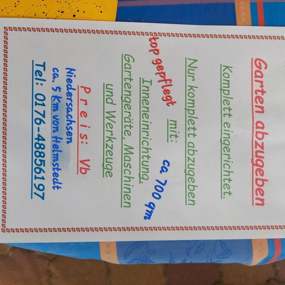 Abzugeben in Niedersachsen; ca 5 Km von Helmstedt. Top gepflegt, mit Werkzeug, Gerätschaften. Strom und Wasser vorhanden.