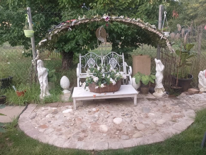 Mit einem Haus, großem Unterstand, Toillette, doppelte Schaukel, Trampolin, 25 Fruchtbäume, 50 verschiedene Rosensträucher, Gerätehaus mit 2 großen Sonnenschirmen, Komposttonne, 2 große Wassertonnen, Rosenbogen und viele Garten Gebrauchsgegenstände.