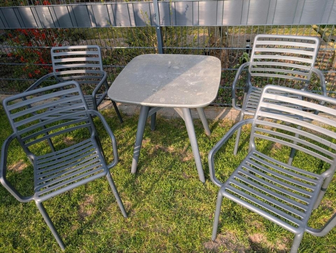 der Tisch ist optisch nicht mehr ganz so top, aber mit einer Tischdecke drauf ist er noch super zu gebrauchen