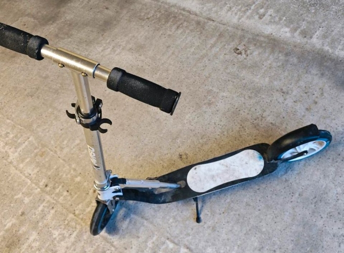Gebrauchter Roller/Scooter zu verkaufen. Die Hauptfarben sind weiß, silber und schwarz. Der Roller ist für den Transport zusammenklappbar, hat einen Trageriemen (nicht auf den Fotos) und einen kleinen Ständer. Der Roller hat normale Gebrauchsspuren, ist aber sonst unbeschädigt und funktionstüchtig.