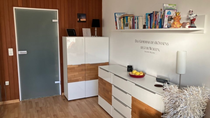 Das Wohnzimmer ist praktischerweise mit einer Holzwand geteilt, sodass der Schlafbereich bei Eintritt ins Zimmer nicht sichtbar ist. Das macht es sehr gemütlich. Ein großes Wohnzimmerfenster und die Balkontür sorgen für reichlich Licht im Raum. Der mit einer Steckdose versehene Balkon (West-Lage) ist groß genug für Tisch; Stühle und Blumen. Eine orangefarbene, manuell ausfahrbare Markise schützt vor Sonnenbrand! Über den Flur gelangt man in die Küche, die mit einer Schiebetür geschlossen werden kann. Die Küche, bestehend aus Herd (Cerankochfelder), Ofen, Kühlschrank, Ober- und Unterschränke, ist zweckmäßig klein aber sehr fein. Von der Küche kommt man in das Bad mit Duschbadewanne, Alibert und Waschbeckenunterschrank. Der Blick aus dem Fenster nach Norden beruhigt das Auge, denn man schaut ins Grüne. Auch ein Kellerabteil mit Regalen, ein Wasch- und Trockenraum mit Anschluss für einen Trockner runden das Wohnambiente ab. Eine Garage mit Stromanschluss und Schwerlastregal gehört ebenso zur Wohnung.