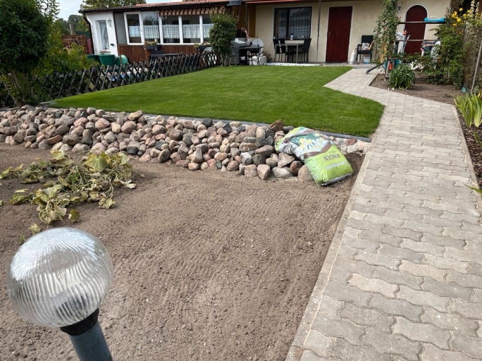 • Vergrößerung der Terrasse ist vorbereitet (Borde stehen + Rundpalisen in anthrazit + vernünftiger Recycling Unterbau + Split)