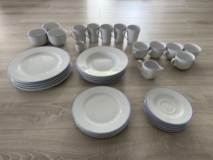 Geschirrset Weiß mit blauem Rand (Nicht vollständig)