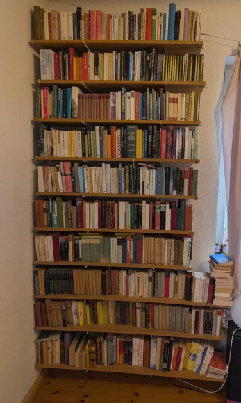 Sehr flexibles System für ein Bücherregal aus Wandschienen und eingehakten Trägerarmen mit Regalböden aus unbehandelten MDF (= Mitteldichte Holzfaser)-Platten zum Selbstaufbau. Die Wandschienen können direkt auf eine tragfähige Wand montiert werden (Schrauben und Dübel nicht enthalten). Sie verfügen über ein Raster länglicher Öffnungen, in die die Trägerarme auf verschiedenen Höhen eingehakt werden können. Dank der robusten Stärke der MDF-Platten (2 cm) gibt es auch bei weiten Spannweiten ohne Zwischenträger kein Durchbiegen der Regalböden unter der Belastung mit Büchern. Der abgebildete Aufbau dient als Muster für die Verwendung. Abgabe in Form der einzelnen Bauteile wie folgt:
