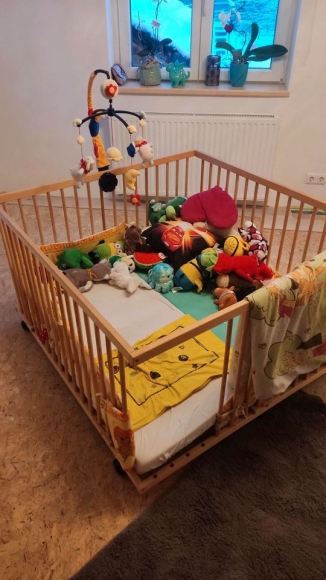 Haben es zum schlafen benutzt. Viel Platz im Bett. 2 Matratzen dazu und gerne die Spieluhr. 120 cm x 120 cm. Eine Latte ist gebrochen aber kann schnell repariert werden. Die 4 Holzstäbe sind natürlich auch vorhanden. Schreibt gerne.