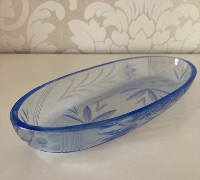 Ovale Schale aus blauem Glas, mit sehr schönem Schliff. Gut zu verwenden als Ablage für Stifte auf dem Schreibtisch, oder Schminkstifte im Bad.