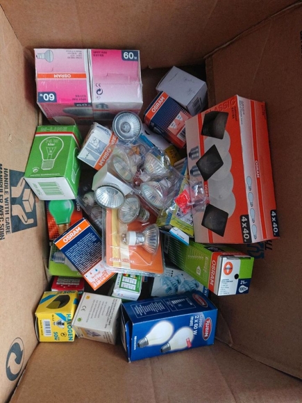 Karton gemischter Glühbirnen, alle neu, teilweise noch in Originalverpackung eingeschweißt.