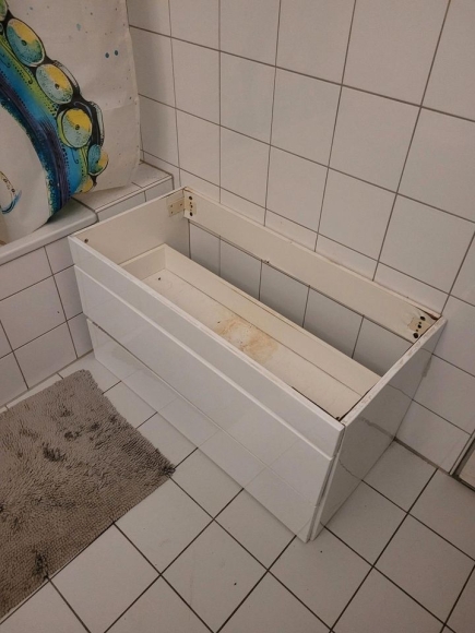 Verschenke hier einen eigentlich guten Badunterschrank. Die Hochglanzfolie ist an einigen Stellen aufgequollen oder blättert ab also brauchts nen neuen Anstrich oder ne neue Folie, aber wer sich die Arbeit machen will kann hier die Möglichkeit genießen, einen einst schönen Badunterschrank in alter Frische erstrahlen zu lassen..oder verwendet es als Brennholz, ist mir egal