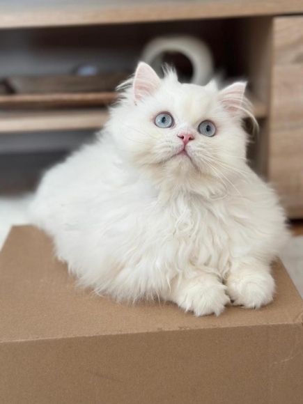 Dieser wunderschöne Britisch Langhaar Kater mit schneeweißem Fell iund hat ein ruhiges, liebevolles Wesen. Er liebt es, gestreichelt zu werden, und genießt jede Minute der Aufmerksamkeit.