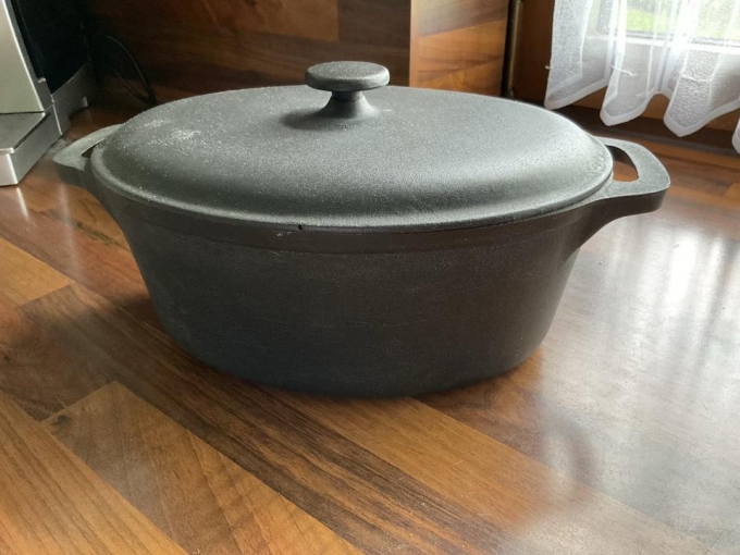 Gepflegter Bräter aus Gusseisen, ovale Form.