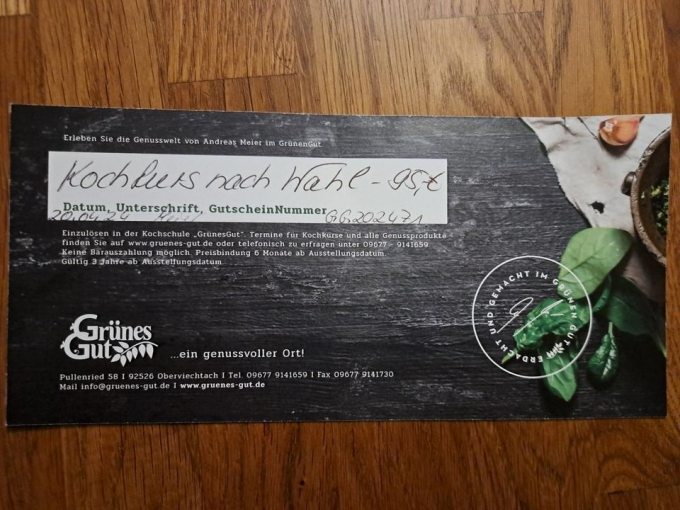 95,-- Euro Gutschein für einen Kochkurs nach Wahl im Grünen Gut,