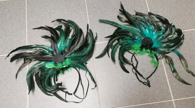 2 Stück Haarreifen mit Federn, blau/ grün/ türkis/ schwarz. Preis 12 Euro für beide.