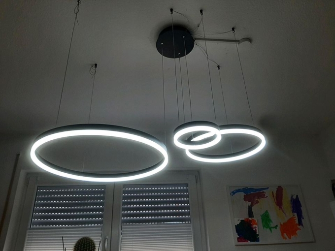 Verkaufen diese Lampe. Der große Ring leuchtet nur Warmweiß. War defekt und wurde ausgetauscht. Die zwei kleineren sind kaltweiß.Mit etwas elektrischem Geschick kann man es bestimmt richten. Bei weiteren Fragen melden