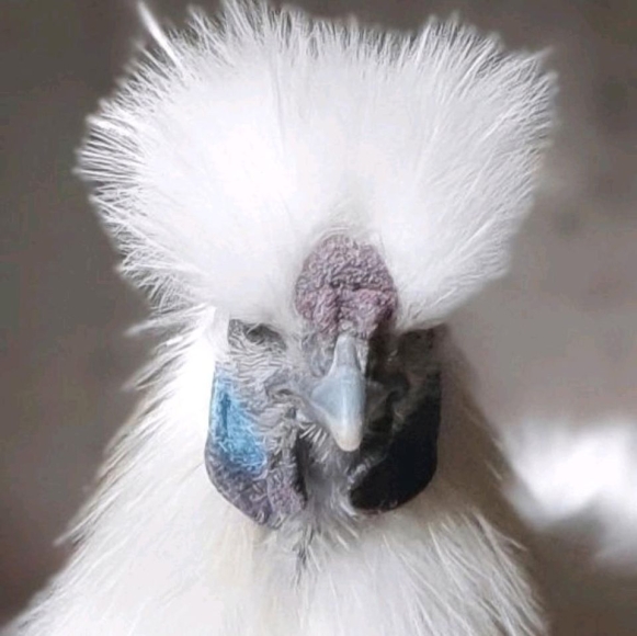 Seidenhuhnhahn in Reinweiß sucht neuen Wirkungskreis.