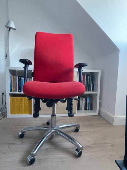Hier steht wegen Home Office Auflösung ein roter Haider Bioswing 360 iQ Bürodrehstuhl in Top-Zustand zum Verkauf.