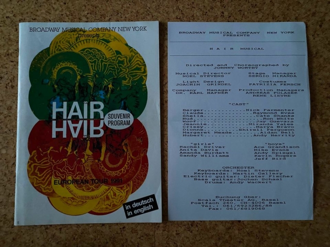 Ich verkaufe hier ein Programmheft (Souvenir Programm) des Musicals "Hair" der Europa Tour 1991 mit Original Besetzungszettel aus einer Vorstellung in Basel.