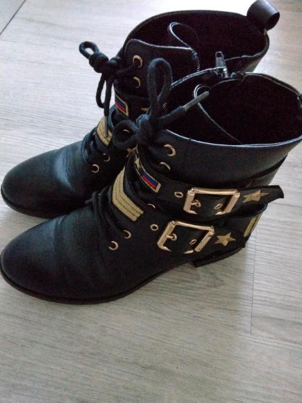 Schöne, schwarze Halbstiefel mit goldener Schnalle und Deko.