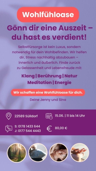 unter dem Motto „Wohlfühloase – Deine Auszeit für Körper und Seele“ nehmen wir uns drei Stunden Zeit nur für dich – für echte Entspannung, Selbstfürsorge und neue Lebensenergie.