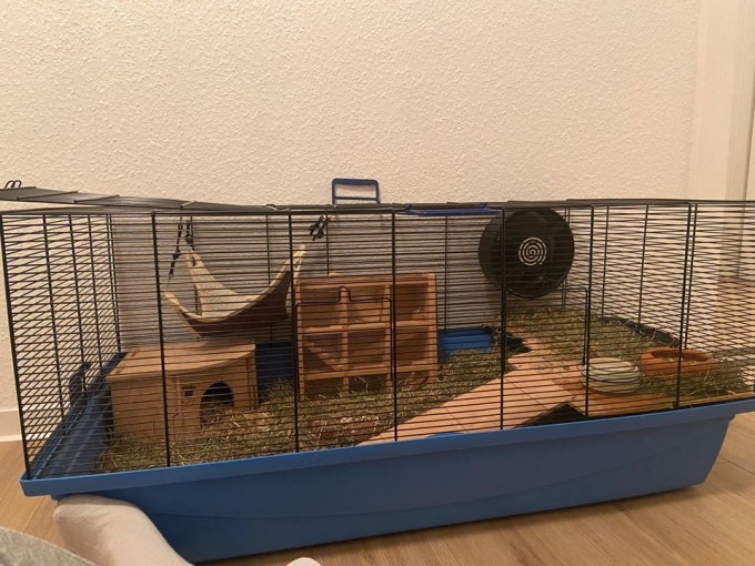 Wir verkaufen einen benutzten Hamsterkäfig. Wir hatten zuvor 2 Hamster (❌NICHT zur gleichen Zeit!!!❌) und brauchen den Käfig jetzt nicht mehr. Der Käfig ist in einem guten Zustand, jedoch haben sich in kleinen Bereichen die Metallstangen etwas abgelöst. Es lässt sich jedoch recht einfach wieder zusammenkleben. Die Größe beträgt 100 x 80 cm. Wir liefern auch das gesamte Zubehör für den Hamsterkäfig mit, z.B. das Hamsterhaus, die Brücke, das Spielhaus und die Tunnel. Das Zubehör und Hamsterspielzeug sind im Preis inbegriffen. Für mehr Informationen könnt ihr euch gerne melden ;)