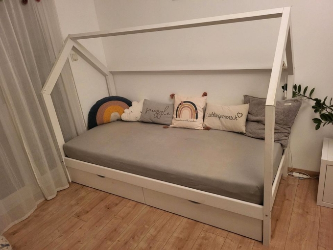 Hübsches Hausbett mit Lattenrost und zwei großen Schubladen abzugeben.