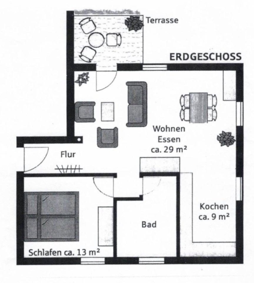 Helle 2-Zimmer Erdgeschoss-Wohnung (nicht barrierefrei) mit großer Terrasse in einem 8-Parteienhaus Baujahr 1992 im Zentrum von Altomünster. Großer Wohn-Essbereich, Flur und Schlafzimmer jeweils mit Parkettböden, Küche mit offenem Durchgang und Bad jeweils mit Fliesenboden. Zur Wohnung gehören außerdem ein abschließbares Kellerabteil und ein Duplexgaragenstellplatz.
