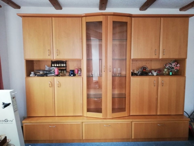 Ich biete hier eine sehr schöne Schrankwand. Die gesamt Breite ist 285 cm. Seitenteile 100 cm, Mittelteil 85 cm. Höhe ca. 176,5 cm. Die Unterschränke sind 42 cm hoch und 55 cm tief.