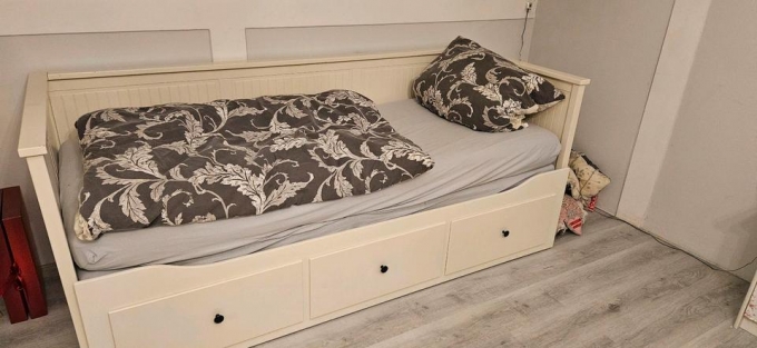 Biete ein gebrauchtes Ikea Bett aus der Serie Hemnes. Es ist 80x200 breit und kann auf gleicher Ebene auf 160x200 ausgezogen werden. Das Bett weist einige Gebrauchsspuren auf.