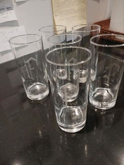 Set aus 6 individuell gestalteten Getränkegläsern, geätzt mit dem Anfangsbuchstaben „F“