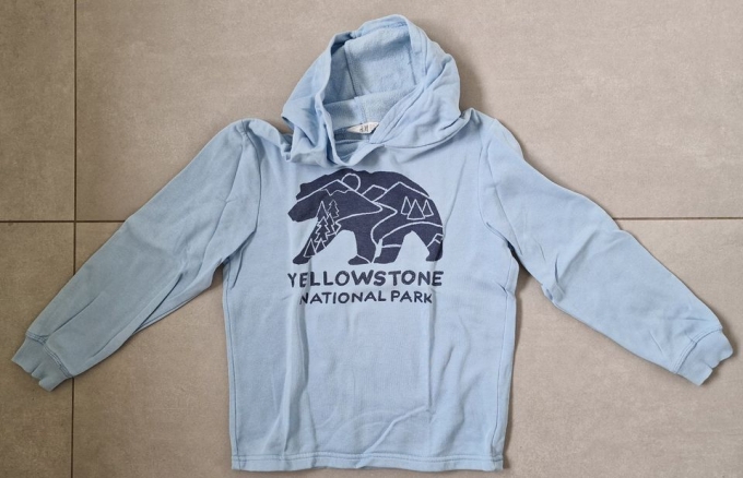 Hoodie von H&M aus einem Sweatstoff mit weich angerauter Innenseite, mit Kapuze und Kängurutasche, hellblau mit Bär und Aufschrift 'Yellowstone Nationalpark', Größe 134-140, wenig getragen, pfleglich behandelt, in super Zustand