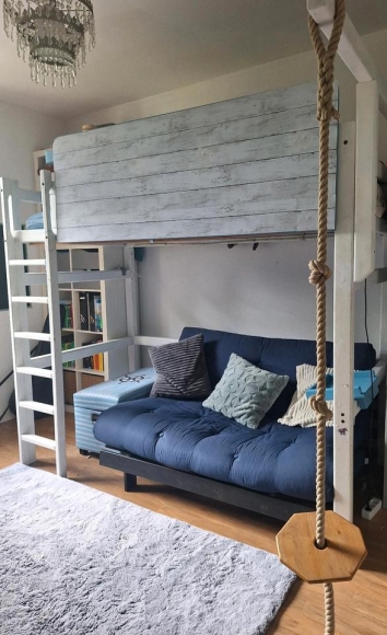 Wir geben unser Hochbett ab. Wir haben das Bett weiß und hellblau (den Rausfallschutz mit Bullaugen + die Decke unter dem Bett mit Sternenhimmel) gestrichen und aktuell ist über den Rausfallschutz eine Vliestapete mit Holzdekor geklebt, die aber entfernt werden kann) Auf Bild Nr. 2 sieht man wie es zuvor in hellblau aussah.