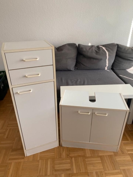 Alte aber voll funktionsfähige Badmöbel, 1 Schrank mit zwei Schubladen und einer Tür, sowie der Waschtisch.