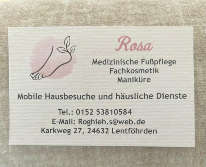 ich heiße Rosa und bin eine zertifizierte Dienstleisterin im Bereich medizinische Fußpflege - Fachkosmetik und Maniküre.