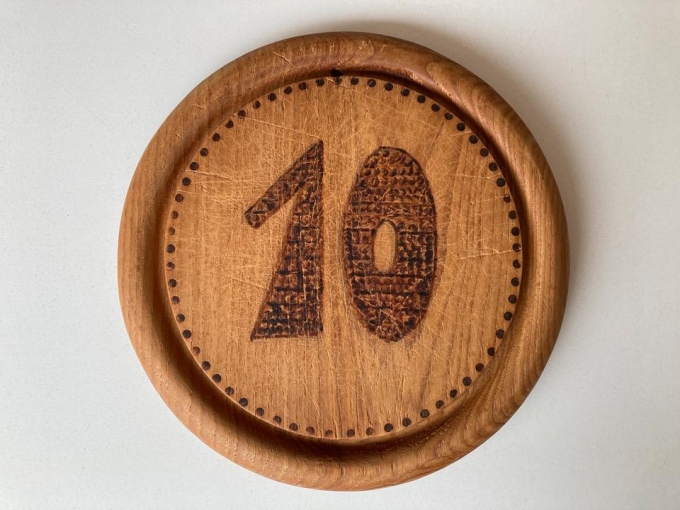 Ich gebe hier ein altes Holzbrett aus den 70er Jahren ab. Es wurde per Handarbeit mit Brandmalerei verziert und zu einem Hochzeitsjubiläum an den Türkranz angebracht.