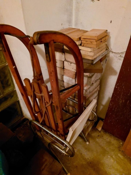 Holzschlitten. Hat jahrelang untätig herum gestanden - würde sich über Bewegung und einen neuen Eigentümer freuen. Die Kufen müssten einmal gepflegt werden.