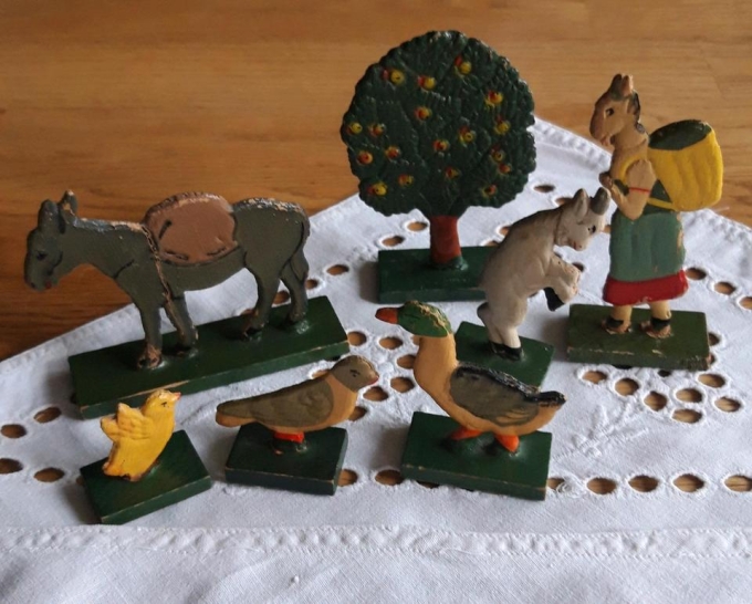 14 teiliges Holzspielzeug aus den 1950iger Jahren, Gebrauchsspuren, Figuren sind zwischen 2 und 7cm groß,