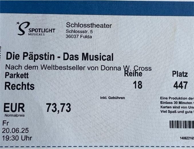 da uns kurzfristig etwas dazwischen gekommen ist, biete ich hier unsere beiden Karten für das Musical Die Päpstin in Fulda, diese Woche Freitag, den 20.06.2025, um 19:30Uhr an. Es sind die Plätze Parkett Rechts, 446 und 447 in Reihe 18, siehe Bilder. Da wir die Karten online gekauft haben, ist ein Versand per E-Mail kein Problem.