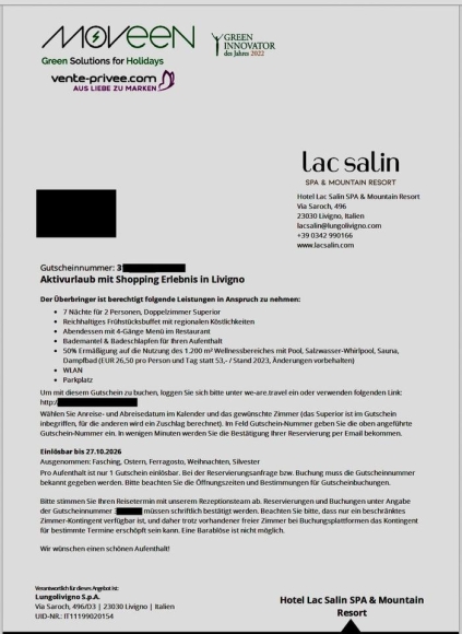 Verkaufe einen Hotelgutschein für das Hotel "Lac Salin Spa and Mountain Resort" in Livigno.